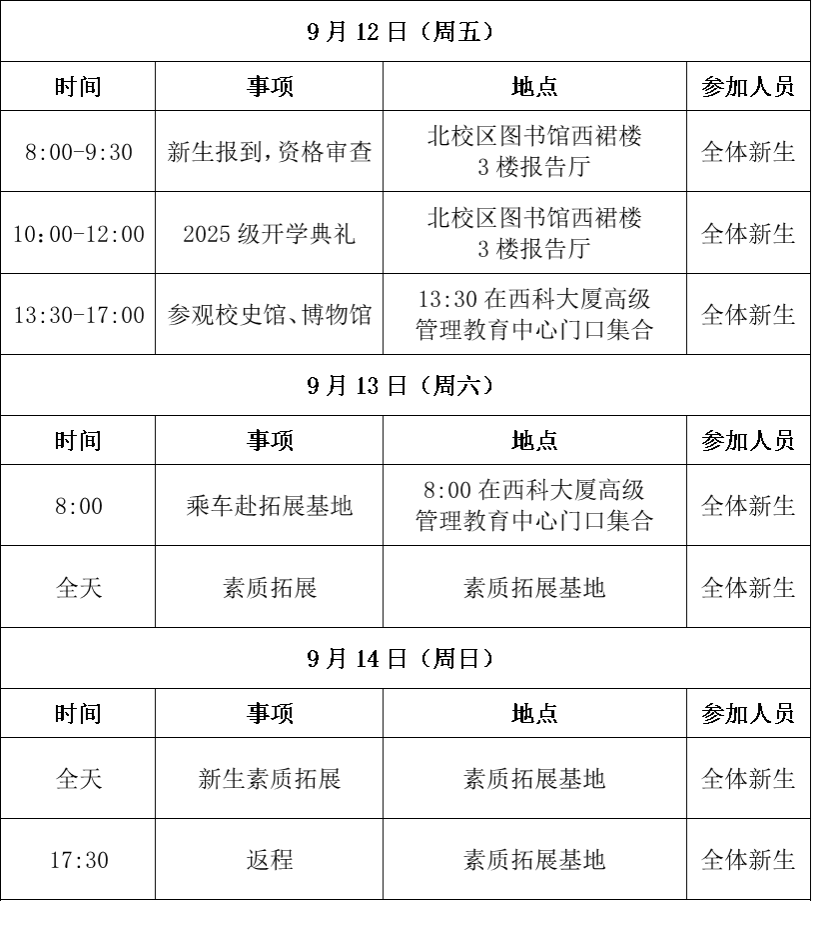 根据学院教学安排,2025级新生入学导航活动将从9月12日启动,具体包括线下报到、开学典礼、校史馆博物馆参观学习、素质拓展等环节,现就有关事项通知如下: