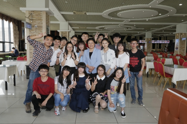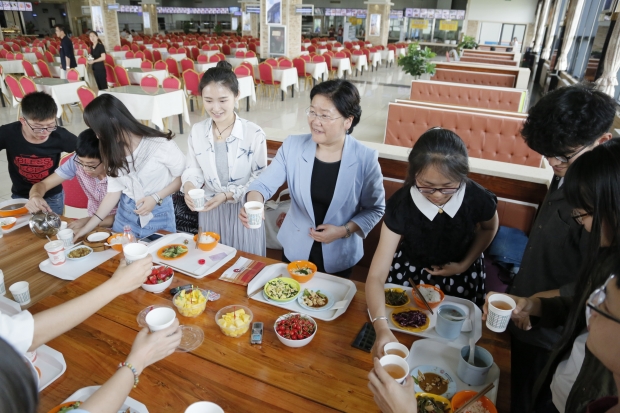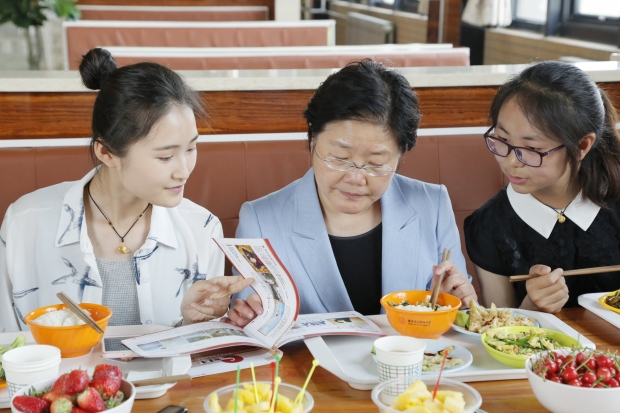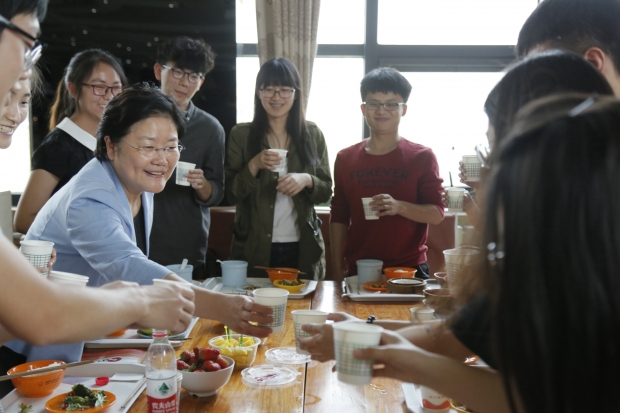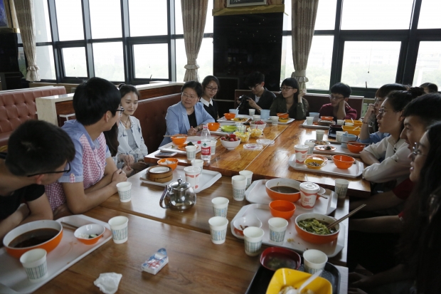 坐在“晓静姐”身旁负责团队日常管理工作的大一学生李宜格和负责团队策划工作的大二学生王娜,分别向校长介绍展示了团队的主要作品集锦和制作精美的宣传册,研一学生闫毅强介绍了团队下一步拍摄学校历史变迁新老对比影像的工作构想……郑晓静不时地放下手中的筷子,仔细聆听着每位同学对自己和工作的介绍,以及对学校建设的建议,并不时与大家交流分享自己的观点和看法。